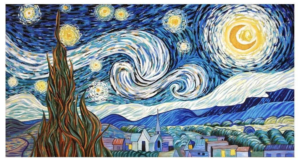 Pinceladas de un cielo estrellado con un pueblo más acogedor y un ciprés no tan oscuro. Mi versión para esta gran obra maestra. El sentido y color de cada pincelada, va construyendo y marcando toda la obra.